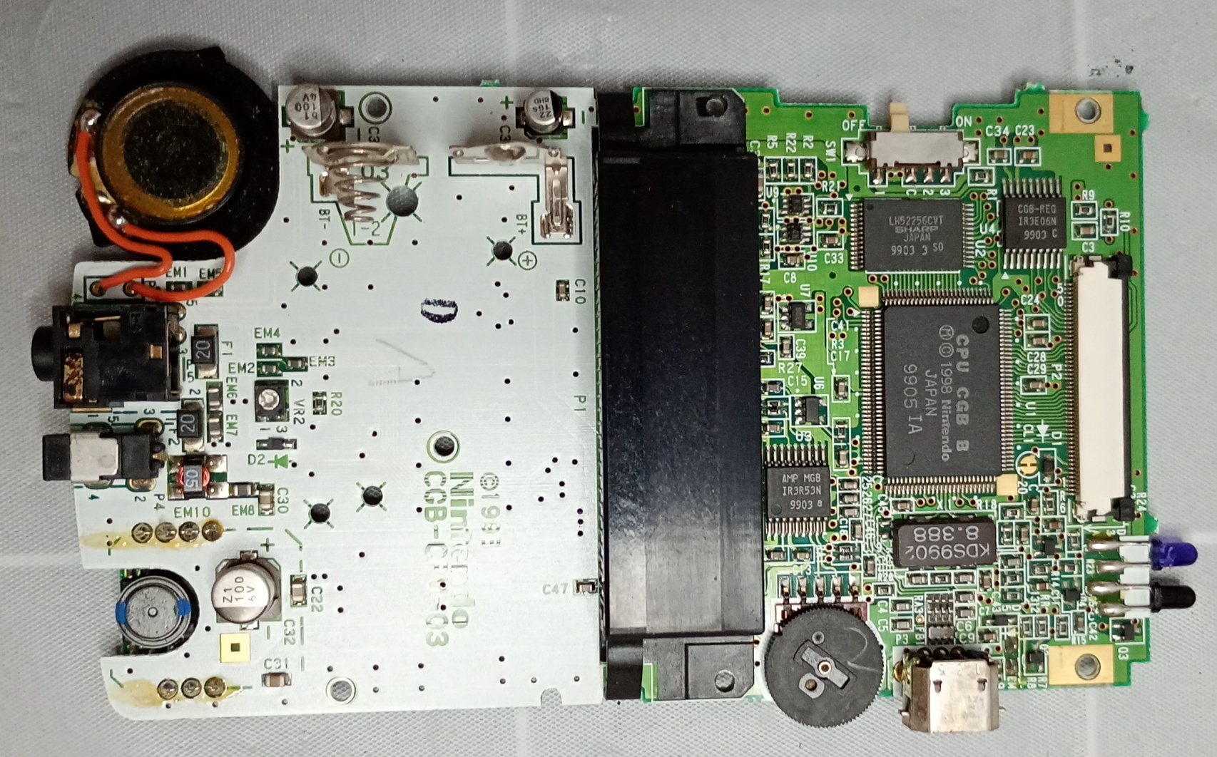 ジャンク品でゲームボーイカラーを入手しました。起動はしますがボタンが一部効かず、スピーカーが聞こえにくいことがあります。通信コネクタと赤外線機能は対応ソフトと通信ケーブルが手元にないので確認していません。洗浄してボタンが効く様になるかやってみました。